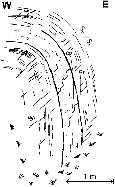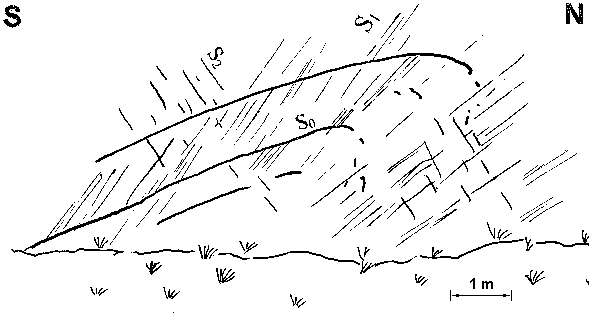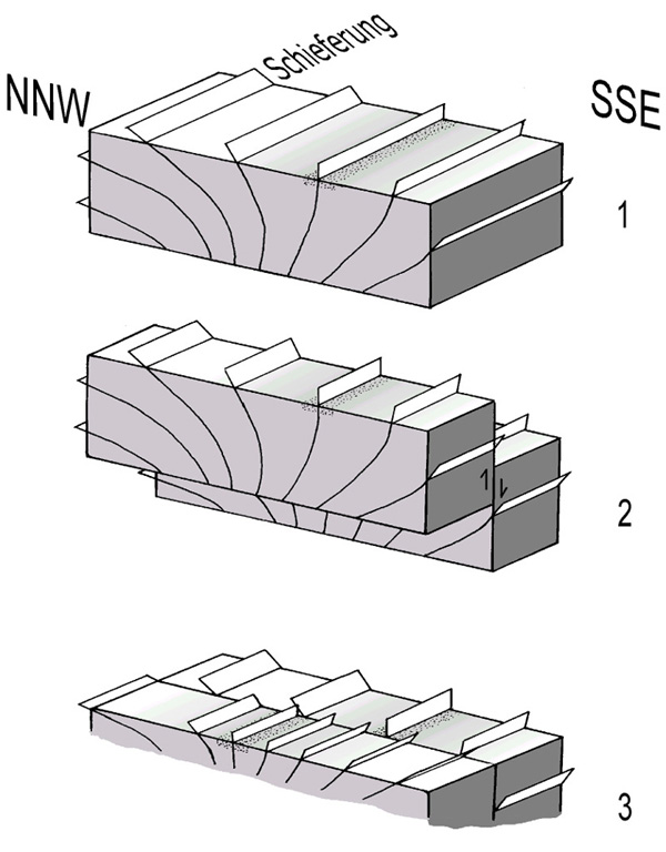 Im Scheitelbereich eines so entstandenen Vergenzfächers liegt das Kartiergebiet. Achsenflächen und Hauptschieferung stehen steil bis saiger. In diesen Bereichen kam es beim Kollaps des Gebirges durch gravitative Kräfte zur Anlage von Knickbändern. Sie ersetzen Verschiebungsflächen. Vereinzelt sind sie auch mit Abschiebungen verbunden.