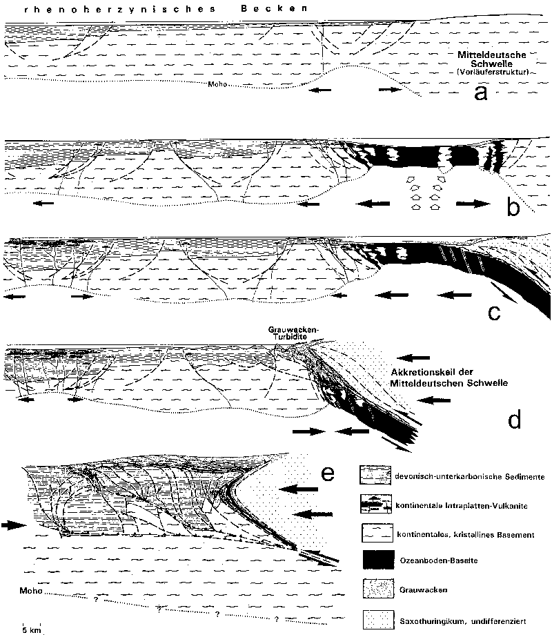 - Bei der Kollision der Rhenoherzynischen Zone mit dem Akkretionskeil der Mitteldeutschen Schwelle schloß sich der Ozean im Unterkarbon und Grauwacken-Turbite wurden von dort aus nord- bis nordwestwärts geschüttet. Die devonischen Sedimente wurden auf ein Drittel ihrer Urbreite verkürzt und anchimetamorph (am Taunussüdrand grünschieferfaziell) überprägt.