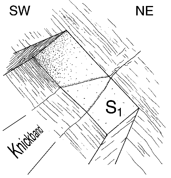 Die am häufigsten aufgeschlossene Knickband-Schar hat nach SE abschiebenden Charakter, eine zweite zeigt NW-gerichteten Bewegungssinn. Sie sind aufgrund der gleichgerichteten vertikalen Einengung zusammengehörend bzw. konjungiert. Die Knickachsen beider Scharen tauchen mit nur wenigen Grad in Streichrichtung ab. Manchmal sind Knickbänder dieser beiden Gruppen direkt konjungiert aufgeschlossen.