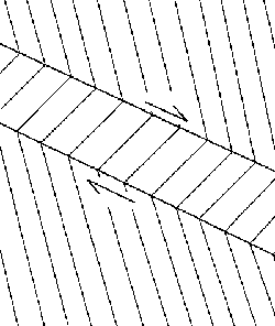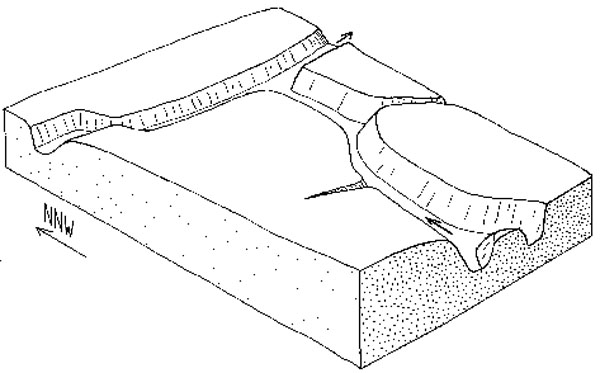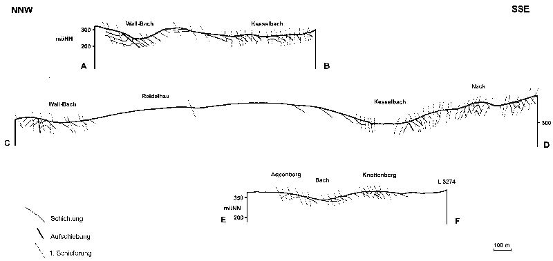Der Verlauf der Scheitellinie der ersten Schieferung im Bereich des o.g. Vergenzfächers ist durch Querstörungen häufig versetzt. In der Idsteiner Senke verläuft die Scheitellinie 2-3 km weiter südlich als in den angrenzenden Hochschollen (ANDERLE 1991). Der horizontale Versatz erscheint möglicherweise nur als solcher: ANDERLE (1991: 124) hält Krümmung des s-Flächengefüges um die B-Achse zur Tiefe hin für möglich. Durch diese Krümmung wäre die Scheitellinie des Vergenzfächers in unterschiedlichen Höhen oder nach Erosion bzw. Einebnung der Hochschollen horizontal versetzt (Abb. 42). Auch mit "horse structures" als Folge einer "flat and ramp"-Geometrie wäre ein solches Modell vorstellbar.