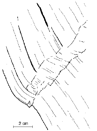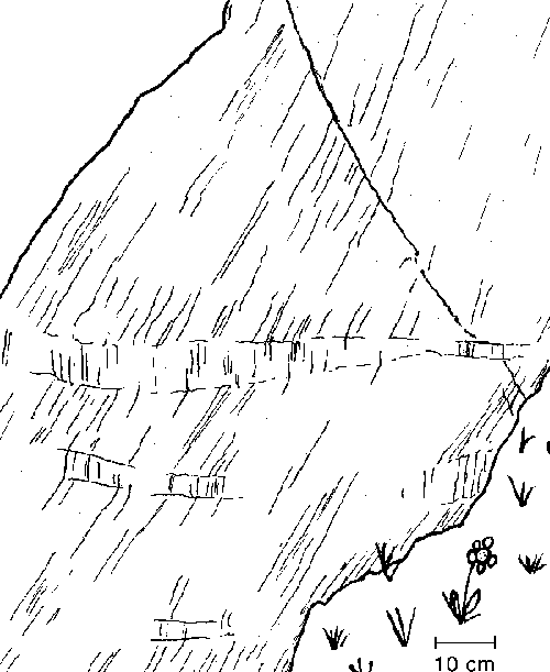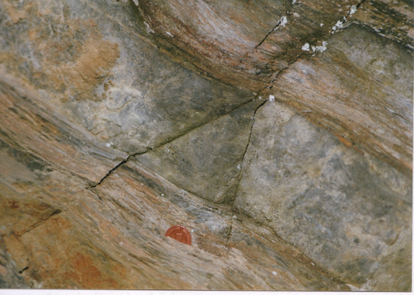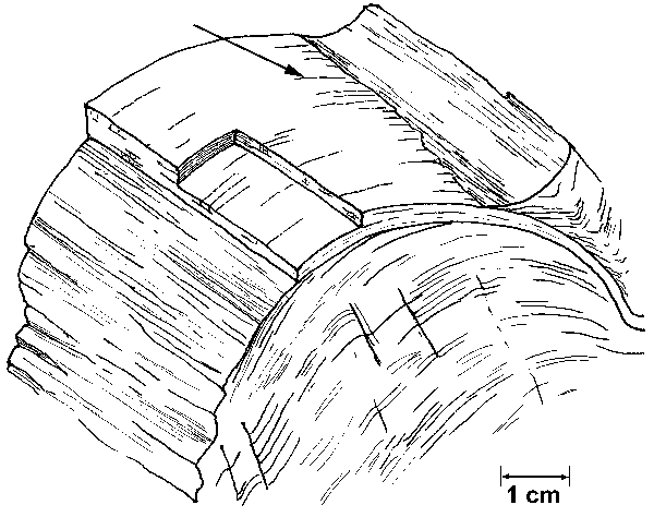 Schwierigkeiten beim Abschlagen von Handstücken mit Knickbändern aus dem Gesteinsverband ergaben sich darin, daß bei Belastung durch Hammer oder Hebel der Zusammenhalt an den Knickflächen verlorenging und die Proben somit für Laborarbeiten unbrauchbar wurden. An bestimmten Lokalitäten wurde auf das Abschlagen von Gesteinsstücken verzichtet, da dort naturdenkmalwürdige Aufschlüsse zerstört worden wären (z.B. an der Herrenmühle im Aartal oder an der Burg Idstein).