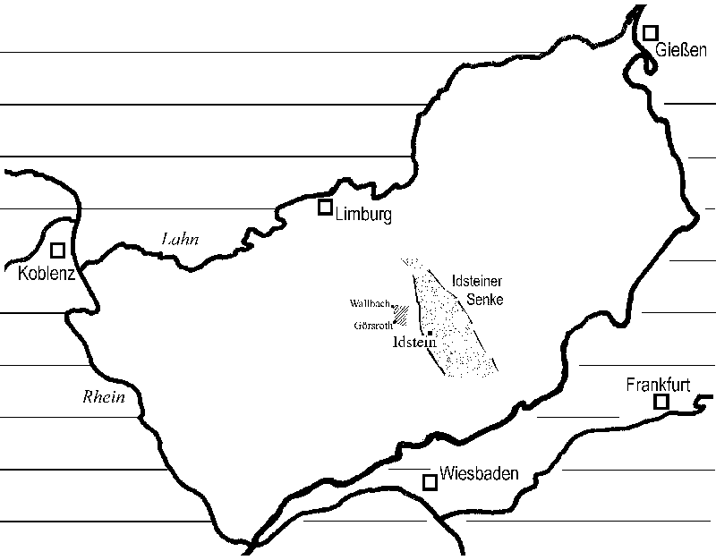Die Grenzen des Gebiets bilden der Wallbach im Norden und der Kesselbach im Osten und Süden mit jeweils beiden aufschlußreichen Talhängen. Die westliche Begrenzung verläuft fast gerade zwischen den Ortschaften Görsroth und Wallbach (Abb. 2).
