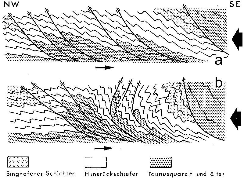 Durch starken Schuppenbau und anhaltende laterale Einengung bei der variszischen Überprägung entstanden im Taunus sogenannte "horse structures": Es kam zu sukzessiver Aufrichtung hangender Schuppeneinheiten bei nordwestlich fortschreitender Anlage von Überschiebungsbahnen im Liegenden.