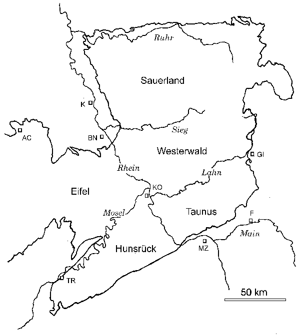 Abb. 1. Das Rheinische Schiefergebirge mit seinen größten Mittelgebirgen, Flüssen und Städten.